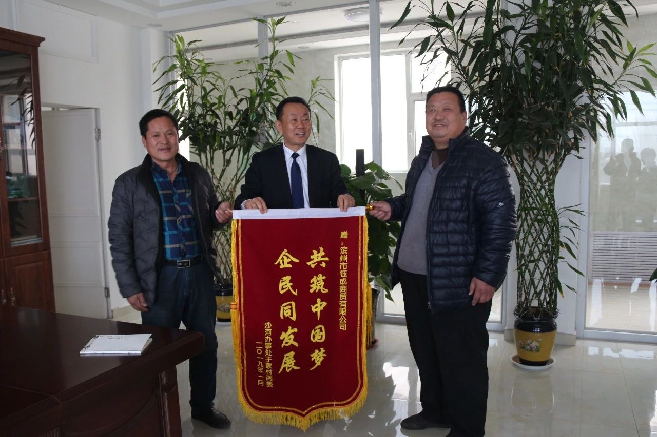 1月30日,于家村“兩委”將一面寫著“企民同發展 共筑中國夢”字樣的錦旗送到了濱州鈺城商貿有限公司,感謝企業一年來對于家村發展所做的貢獻,這也是我辦“村企共建”的典型事例。通過村企共建,有效的推進了企業和農村和諧共處、相互促進、共同提高。